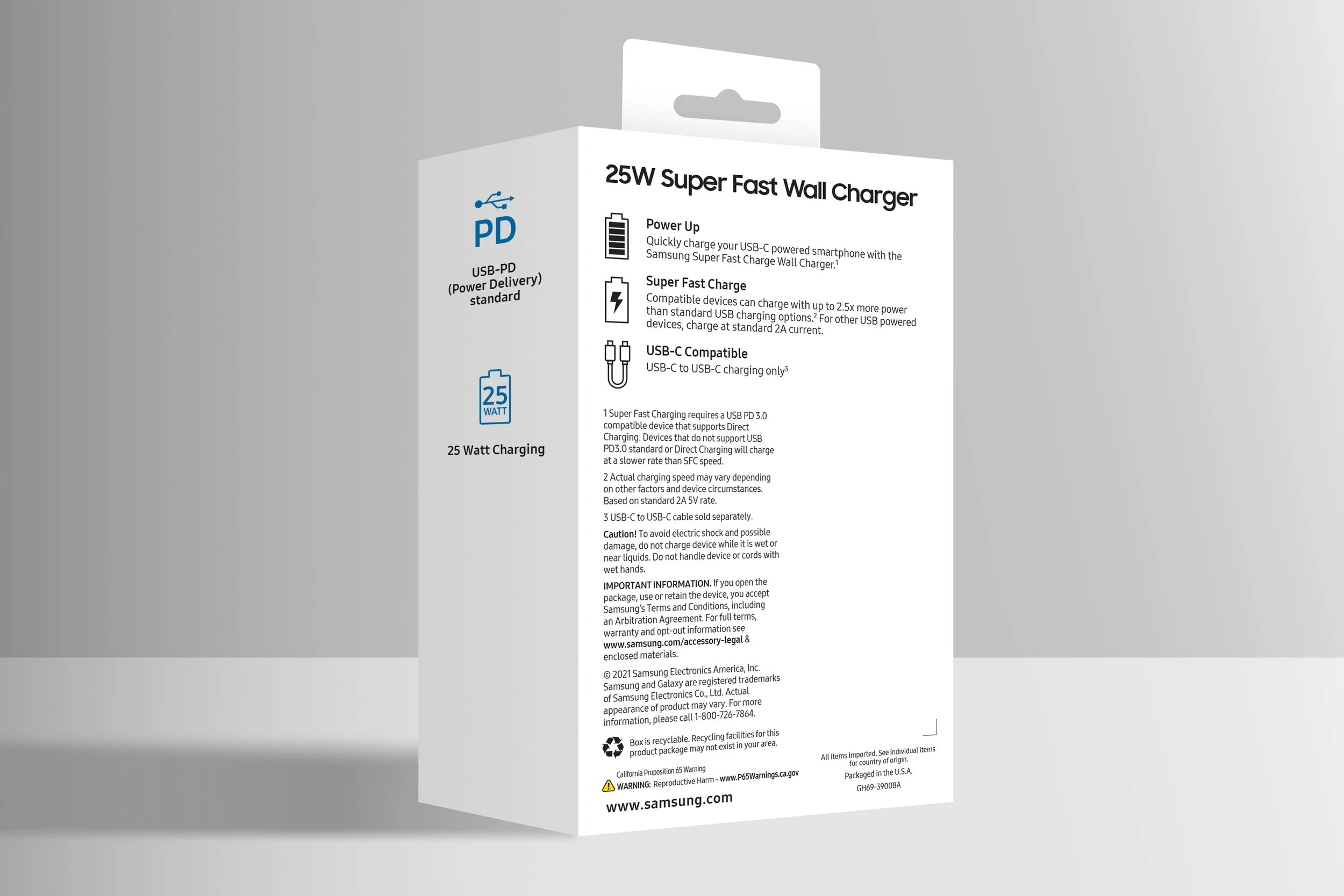 Samsung released their 25W Super Fast Wall Charger in 2021. The request was to design packaging that matched their clean brand. We kept the packaging white to make sure it stood out against all other products in store and used iconography to communicate key features.